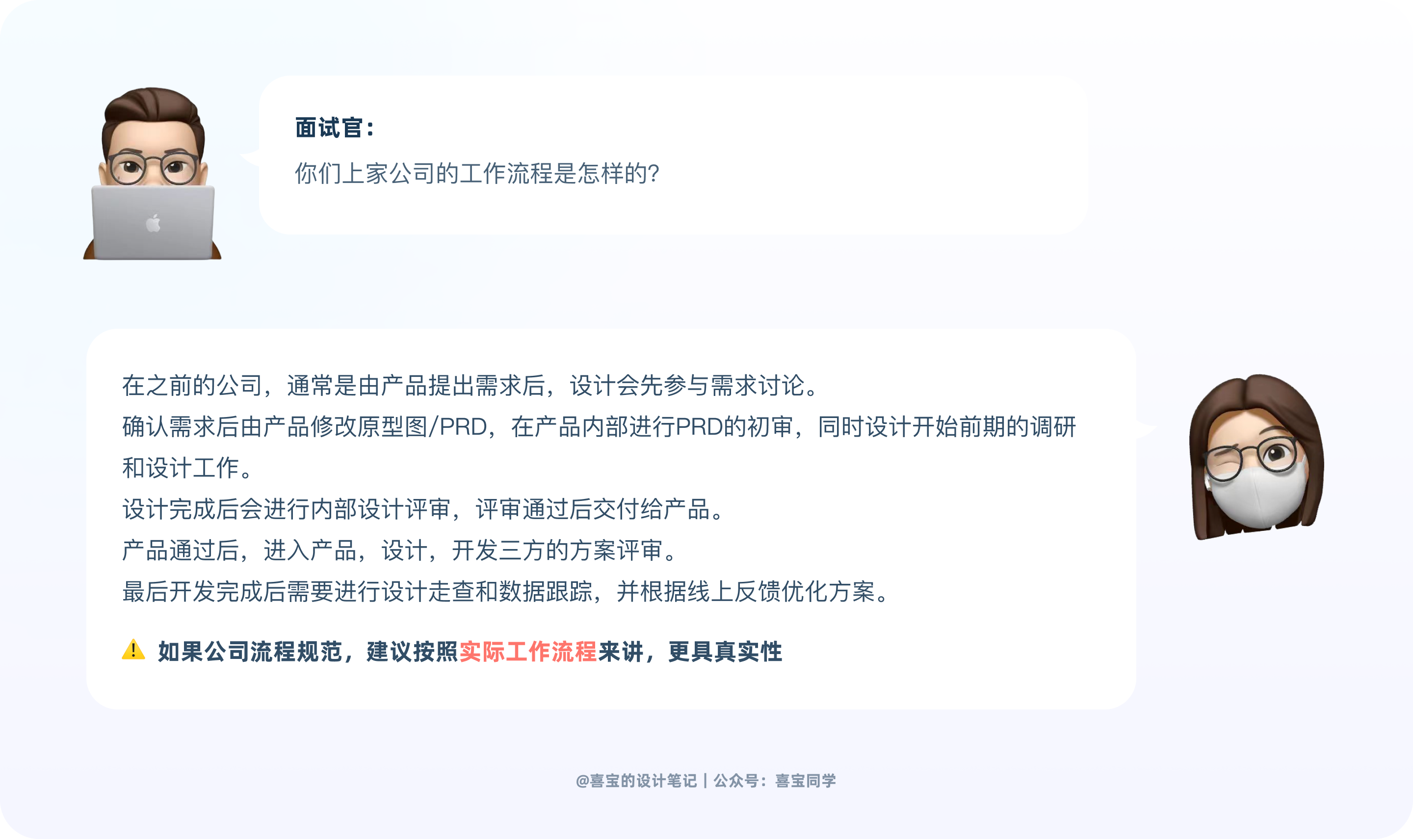 如果公司流程极其不规范,建议按照常规公司的标准流程来回答。如果你说出来的过于不规范,面试官可能认为你不够专业或者不懂常规的工作流程。因此判定你为培训学校出身/在校学生没有实际的工作经验,入职后可能出现合作和沟通方面的问题,甚至因此怀疑作品的真实性。
