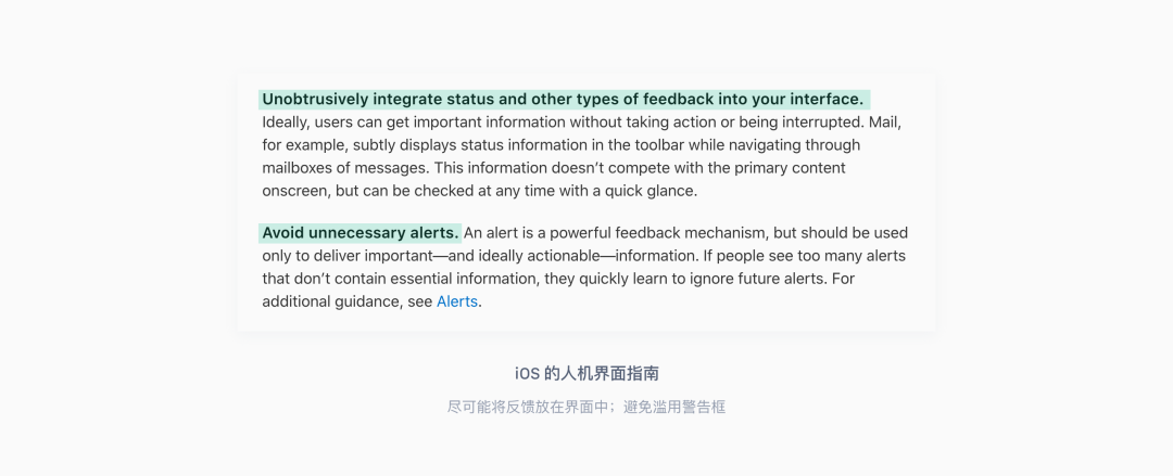 除了尽可能减少不必要的模态体验外,在 iOS 的设计指南中还提到了,要尽可能地将状态改变或其他类型的反馈信息放在界面中,最好是,用户在不进行操作、不跳出当前内容、不被打扰的情况下,就能获得需要的信息。