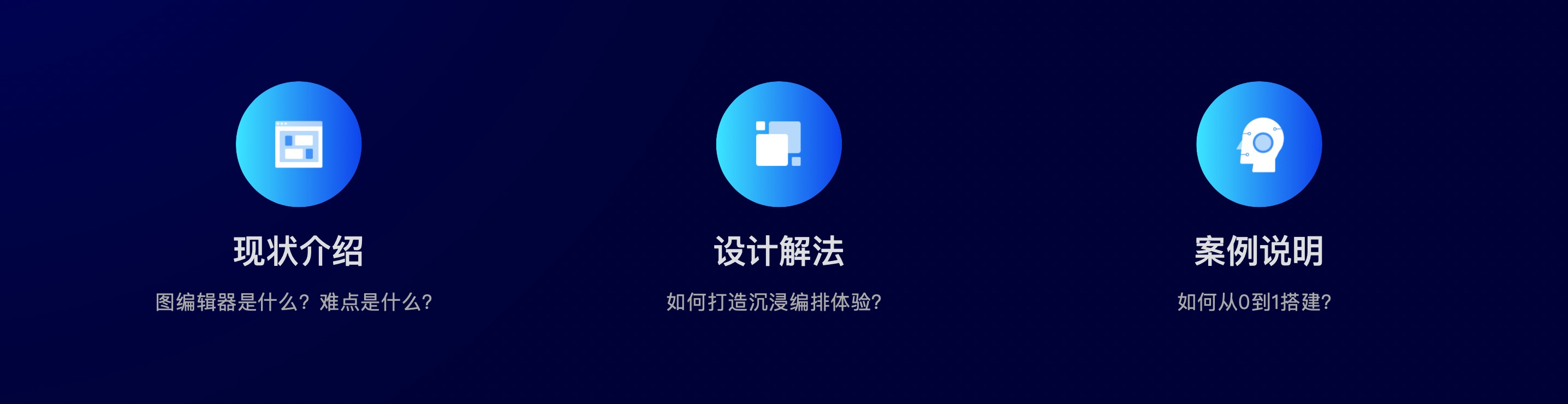 在现状介绍的部分,我们将跟大家介绍那些你可能听起来很陌生,但其实可能很熟悉的图编辑器是什么以及难点是什么。在设计解法的部分,我们将介绍通过内部的实践沉淀出的一些可行性的设计解法,为相关领域的设计师提供一定的参考。在案例说明这一块,我们将通过实际的案例去介绍,在从0到1搭建图编辑器的过程中去如何应用这些解法。