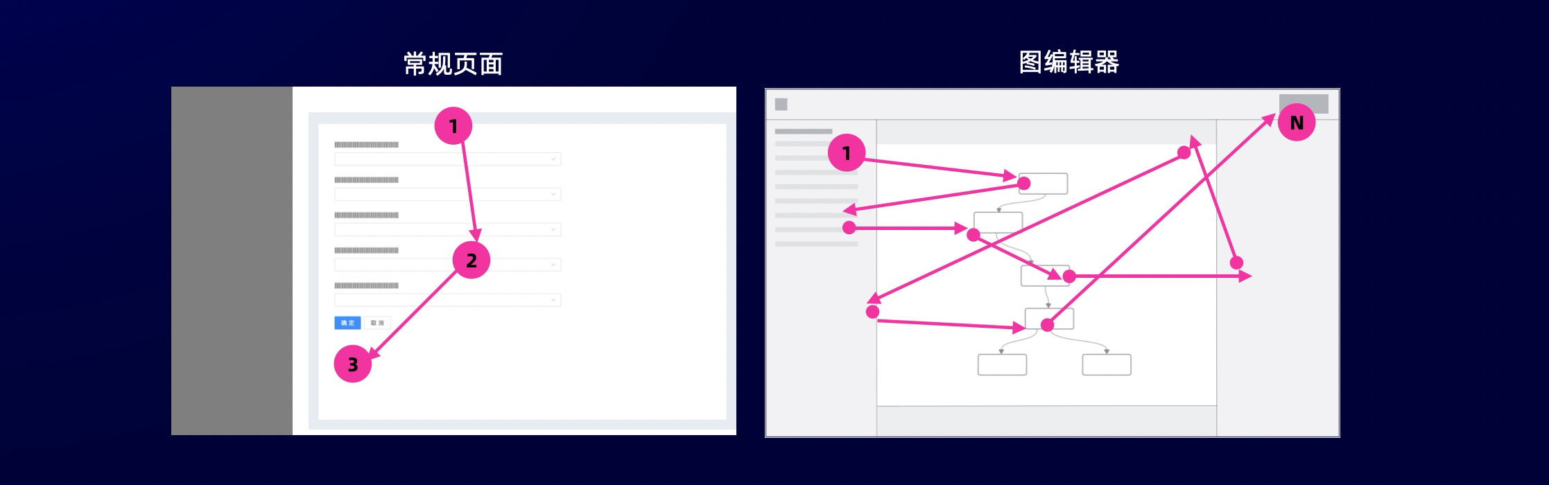 首先是与常规产品的常规工作流不同的是,图编辑器的用户动线非常复杂。比如用户登录注册流程中,核心页面的表单的动线是单一而且明确的。而在图编辑器产品的场景下,用户的动线复杂多样而且无序,这就给我们的设计决策带来了一定的挑战。