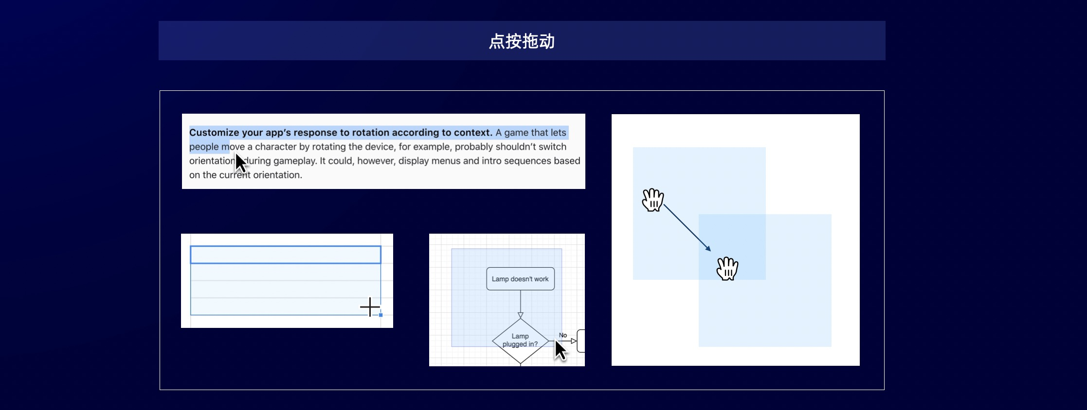 除了图编辑器产品中的任务动线无序跟任务复杂以外,图编辑器产品其实还存在一个难点,就是它的交互模式复杂且灵活。举个例子啊,同样的一个点按拖动的手势,它在不同的场景下,其实可能代表着不同的一个交互语义。有的时候他可能是去圈选一些对象,有些时候呢,它可能代表着我们要去移动画布。那在编辑器场景中我们要去如何结合用户不同的诉求,为之匹配更合适的交互手势,其实也是一个比较大的设计难点。