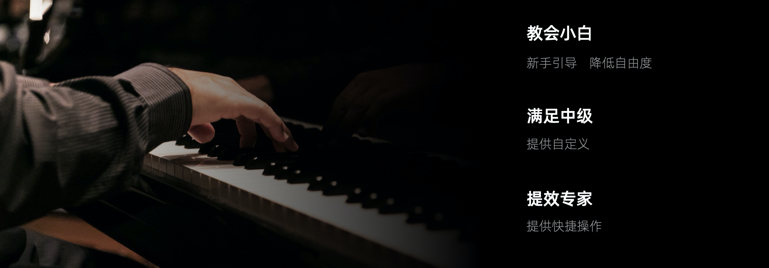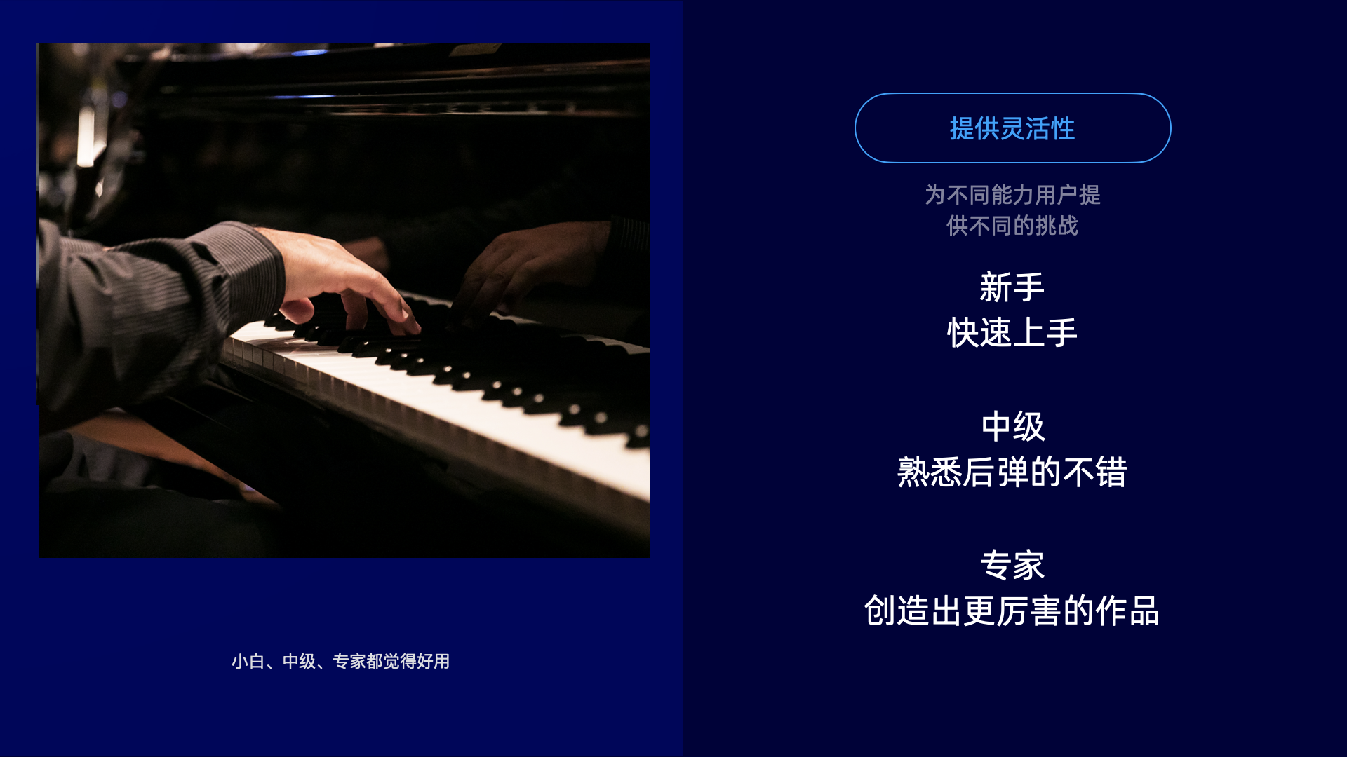 接下来给大家介绍提供灵活性的原则。相信大家即使没有去系统的学过钢琴,可能也会有弹奏钢琴的一个体验。我们会发现如果把钢琴看作一个系统的话,它是堪称完美的。为什么呢?因为我们发现,即使是钢琴的小白用户,也可以通过简单的点按弹奏出悦耳的音调。而一个钢琴的中级用户通过短时间的学习能够弹出不错的歌曲。而我们的艺术大家们也可以通过钢琴这一个系统,创造出厉害的艺术作品。那么把图编辑器打造成像钢琴的那样一个系统,就是我们最终极的一个目标。所以我们希望图编辑器的灵活性是足够的。