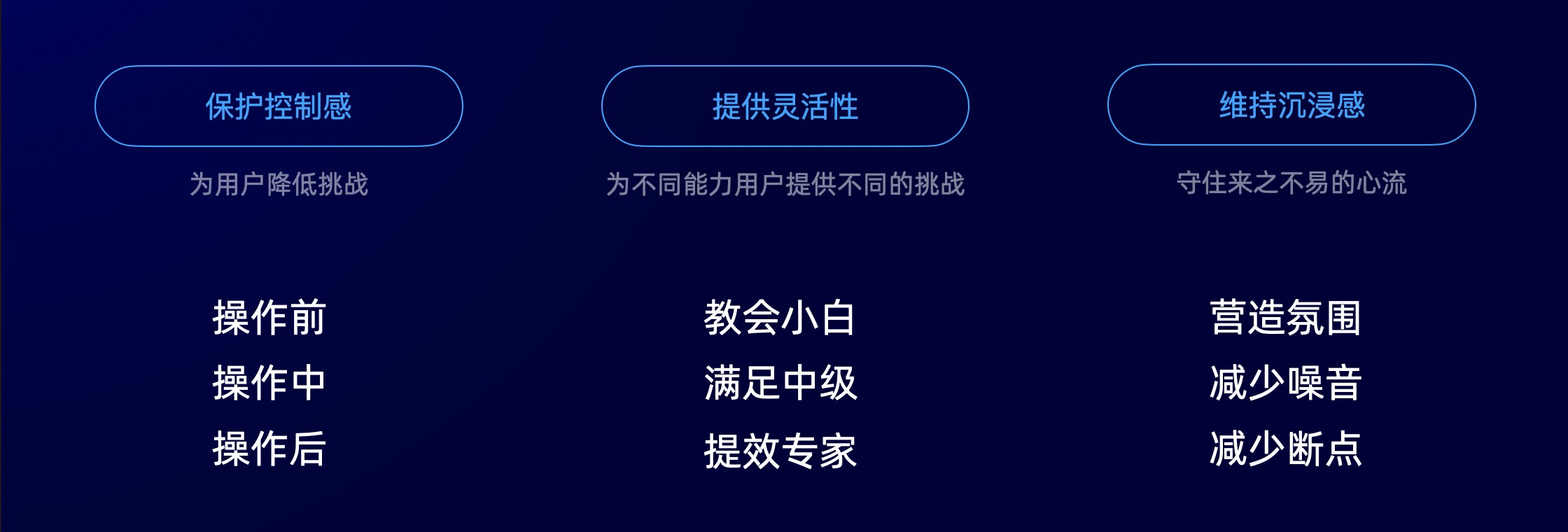 在此基础上我们提出了保护控制感,提供灵活性以及维持沉浸感三个原则: