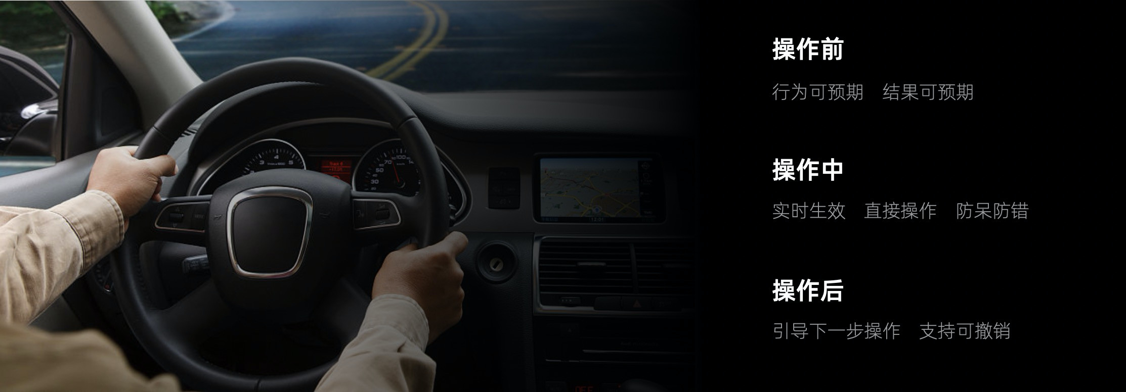 我们发现,其实汽车本身的一些设计其实能够消除掉我们的这种不确定性,给我们的驾驶体验带来很强烈的控制感。比如我们在操作前会发现整个的驾驶界面与我们在驾校看到的并无差异,整个的操作界面是非常熟悉的。然后在操作过程中的时候,我们会发现这种转弯掉头的操作非常的顺畅和便利,并没有跟驾校有什么不同,而这种感受也是也能够消除到我们的一种的不确定性。接下来进入我们转向的调节操作,转向灯开启后,“哒哒哒”的声音虽然微弱,但是非常的明确,这种感受也弥补了我们的一个控制感。如果把汽车看做一个很复杂系统的话,其实图编辑产品跟它其实有异曲同工之处,我们在设计图编辑器产品的过程中,如果想要保护用户的控制感,也可以从操作前、操作中、操作后这三个维度来进行考虑。