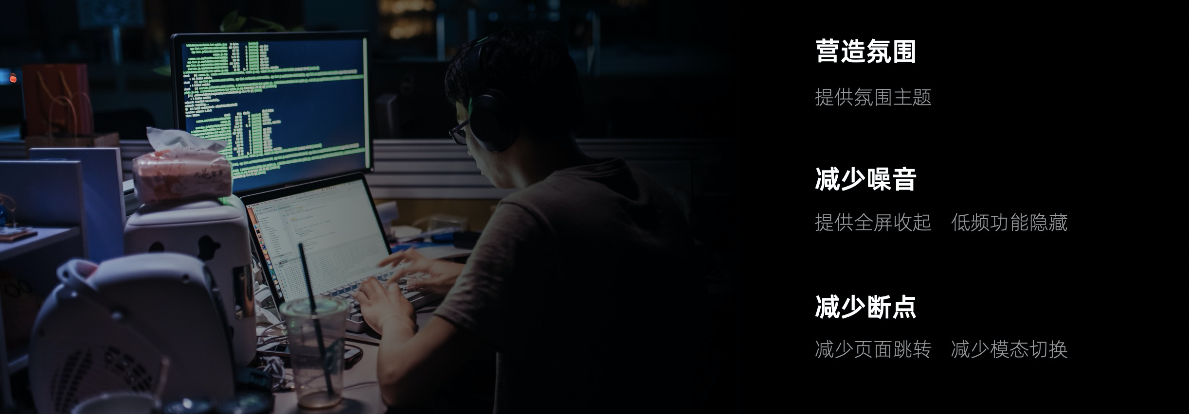 “减少噪音”实际上减少噪音就是让用户能将注意力集中在内容区:可以支持全屏及各面板的收起,但是将面板收起但时候,也需要考虑不影响用户的操作行为。例如,让操作面板在用户需要的时候出现,面板可自由拖动或放置到内容里,具体的规则设定,可以根据业务特性来看。