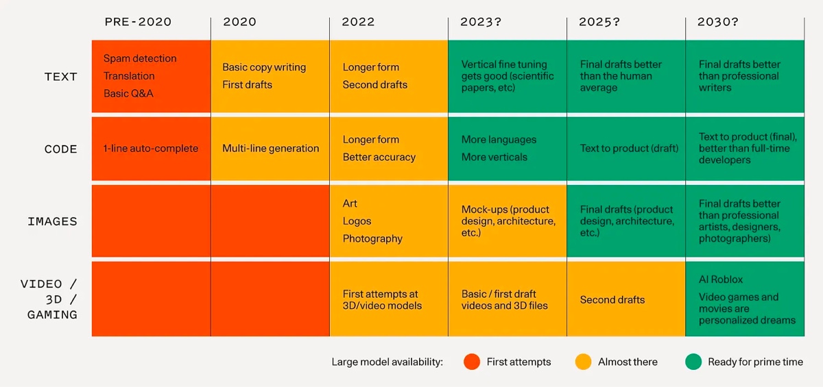红杉资本曾经做过一个关于 AI 能力发展的预测,在它们看来,在 2025 年左右 AI 的产品设计能力会开始比较靠谱,而到了 2030 年它的生成能力可能已经不亚于人类设计师。
