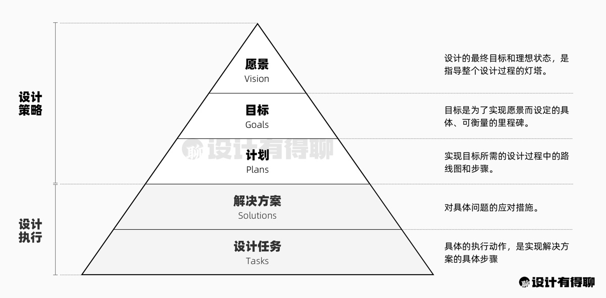 在这个金字塔模型中,五个层级从下至上依次为设计任务、设计解决方案、计划、目标和愿景。这个模型清晰地展示了设计工作的两大领域:设计执行和设计策略。