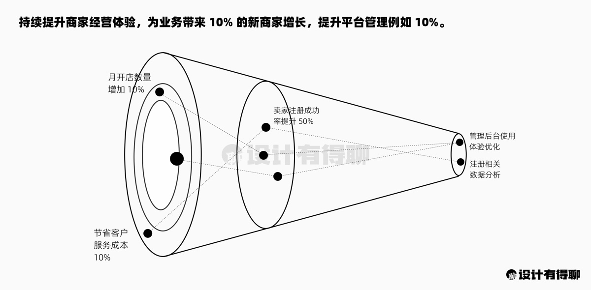 还是以「让商业美而简单」为例,我们需要关注产品的体验,也更需要关注设计对企业目标所带来的价值。比如业务的一个年度目标是:持续提升商家经营体验,为业务带来 10% 的新商家增长,提升平台管理例如 10%。