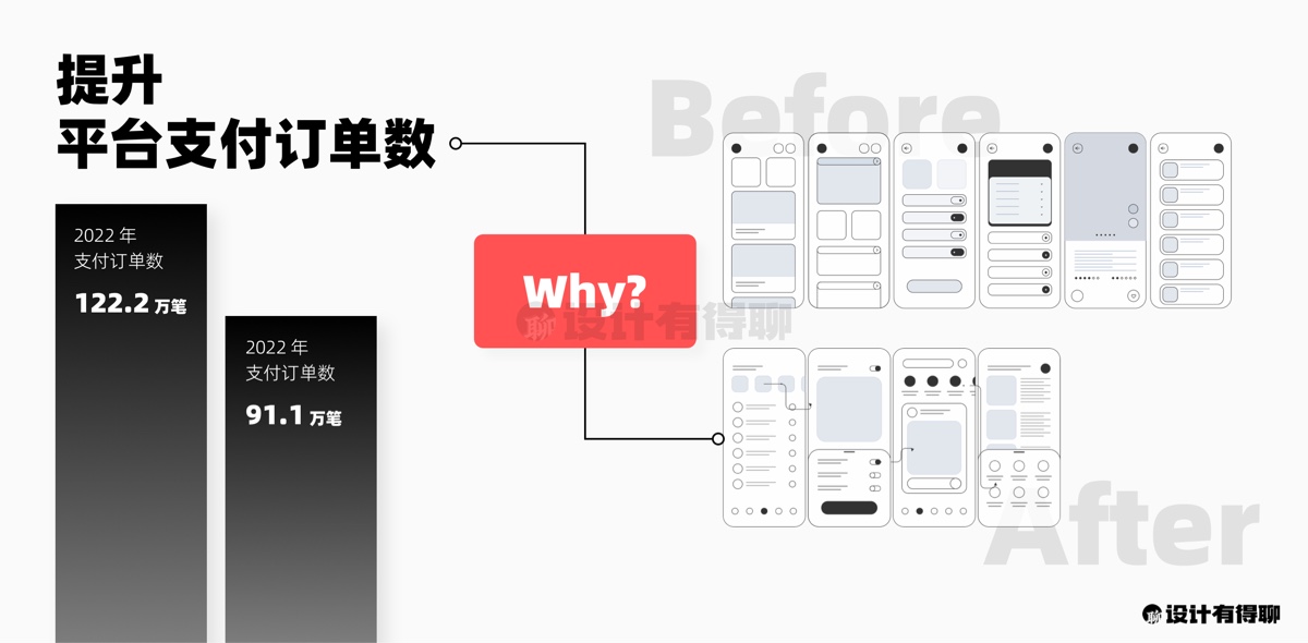 当下整体业务面临的一个很大问题是,支付订单数相比去年下降了约30%。大家都在想尽办法来扭转这个局面。这个时候,我们做了一次购物链路的改版设计,在整体方案中我们给出了多个流程和细节的调整,想要以此来改善用户的购物体验,最终帮助平台提升支付订单数。