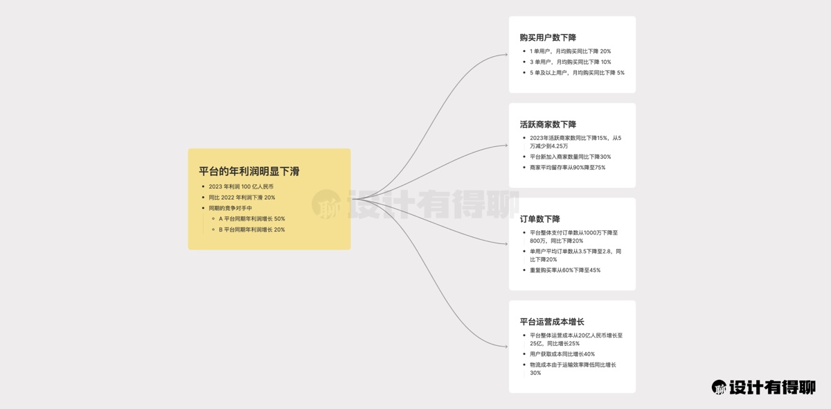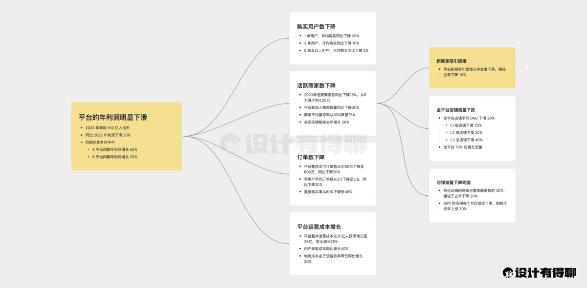 在这里,我设定的核心问题定位是“平台年利润明显下滑”。基于对业务的理解和分析,我们可以将其拆分为四个主要分支问题: