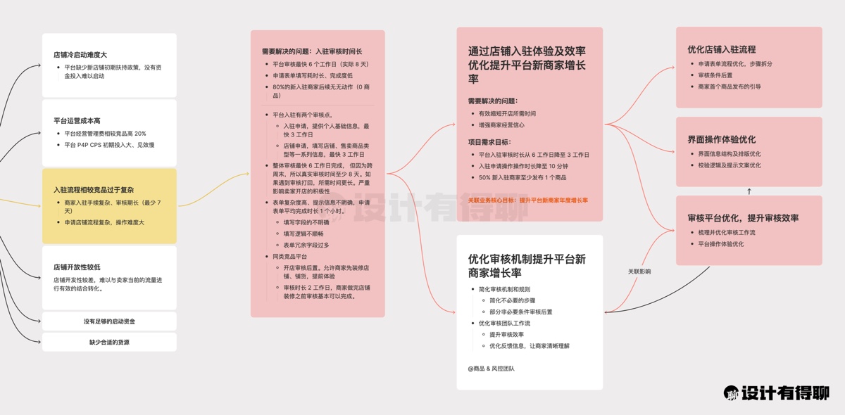 有了这些背景和分析后,我们就可以明确在这件事情是设计师应该从哪里下手,制定怎样的设计策略。比如在这个环节中,设计重点需要解决的是「入驻流程相较竞品过于复杂」的问题。
