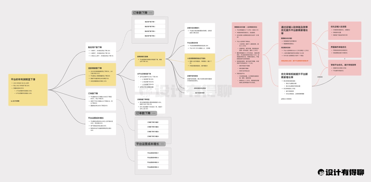 当然,转变思维说起来简单,但实际上还是需要我们在日常工作中不断实践和锻炼的。在这个过程中,还是有一些方法工具能够给我们提供帮助。而这其中,「问题树」就是一个非常有效的方法,能够帮助我们从商业目标出发,逐步拆解问题并推导出我们的设计策略。