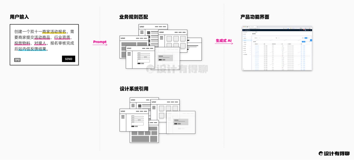 设计其实不仅仅是界面视觉的呈现,它更重要的是承载产品的业务逻辑和行业规则。生成式 AI 需要与它们一起进入到产品中,打通数据和信息,才可能能生成符合业务需求的界面设计,从而在设计中起到实质性的作用。