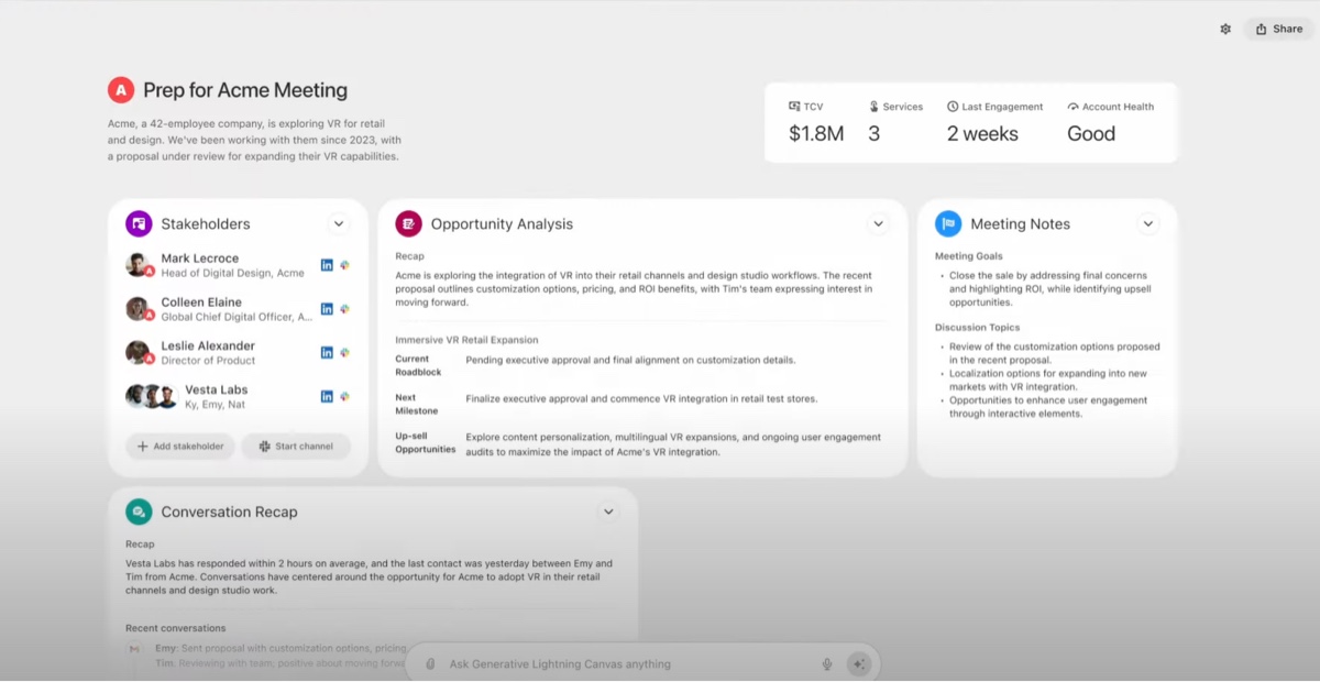 对于一个没有设计相关经验的人员来说,这需要花费大量的时间和精力。而借助生成式画布,他只需要输入一个「生成与 X 公司的月度沟通会议的准备材料」,系统便会自动聚合相关数据,生成一个整洁、直观且实用的画布界面。