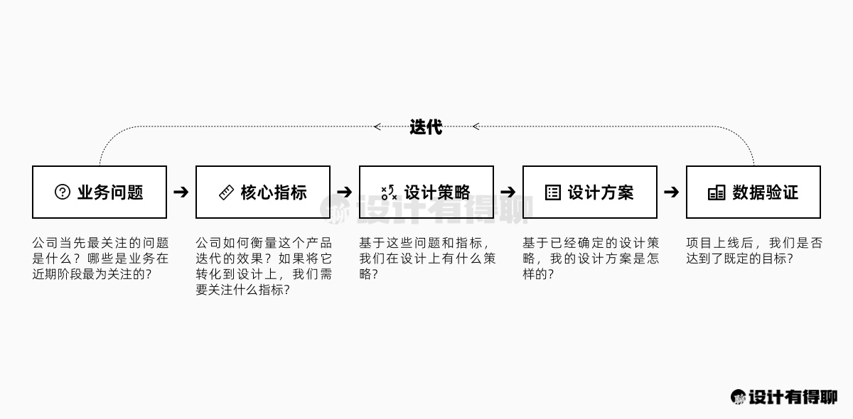 对于建立作品集的案例,通常我会沿着「业务问题 → 核心指标 → 设计策略 → 设计方案 → 数据验证」这条路径来进行分析,这也是一个合格的案例所需要具备的基本框架。