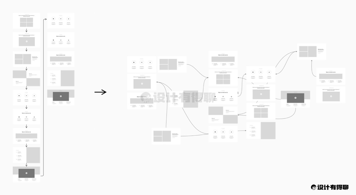 平常我们看到的简历作品集基本都是 ppt 或 pdf,这是一种线性结构的文档,它即是我们面试过程中与面试官共同的参照物,同时也是我们在案例讲解过程中的提纲。面试的时候大多都会顺着文档一页页地进行讲解,因此在自己演练的时候大多也是按照这个逻辑来进行的。