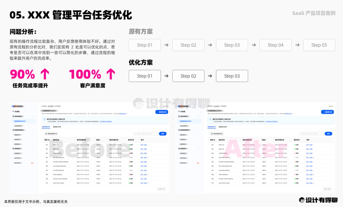 下面这张图是一个案例的演示示例,这也是作品集中最常出现的一种形式。我们通常会在这里呈现项目的背景问题、方案思路、项目的数据结果以及设计的前后对比等信息。