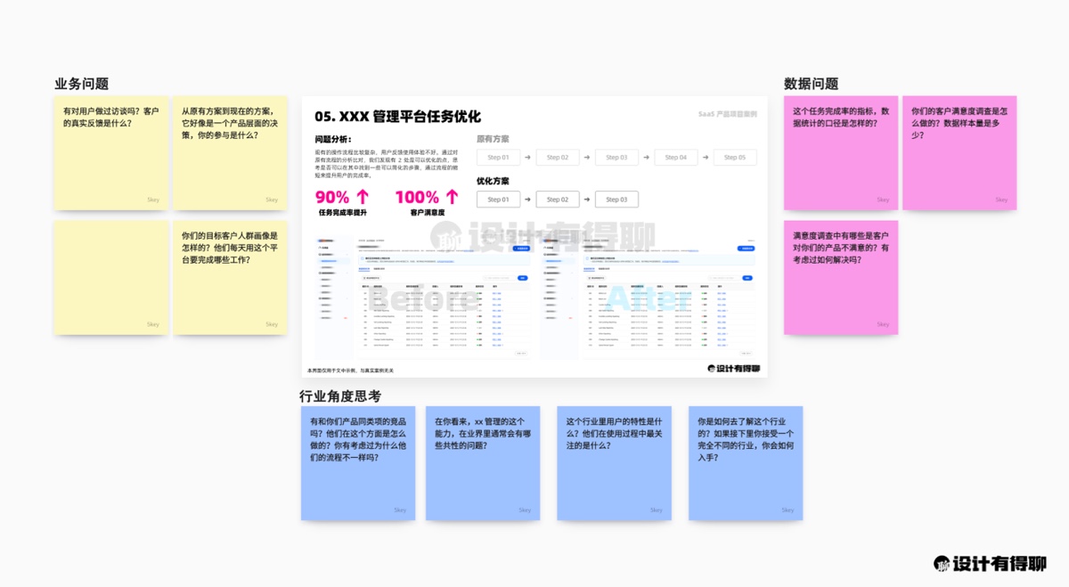 而在面试环节中,面试官往往是非常关注数据的。正是因为设计师在数据方面的弱势,所以他们很清楚项目结果背后数据可能存在的“问题”。因此,对于案例中的那些数据结果,面试官天然是存疑的。如果我们再没有想清楚这背后的关联、逻辑,这部分的讨论大概率我们会被挑战得很惨。