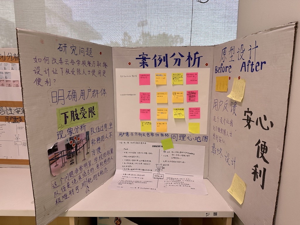 分享会结束后我特地去教学楼里去转了转,碰巧在云谷的图书馆里看到了云谷小学部六年级学生的项目展示。如下图中这些「如何让残疾人更安全地过马路」和「如何改善学校餐厅取餐设计」等。