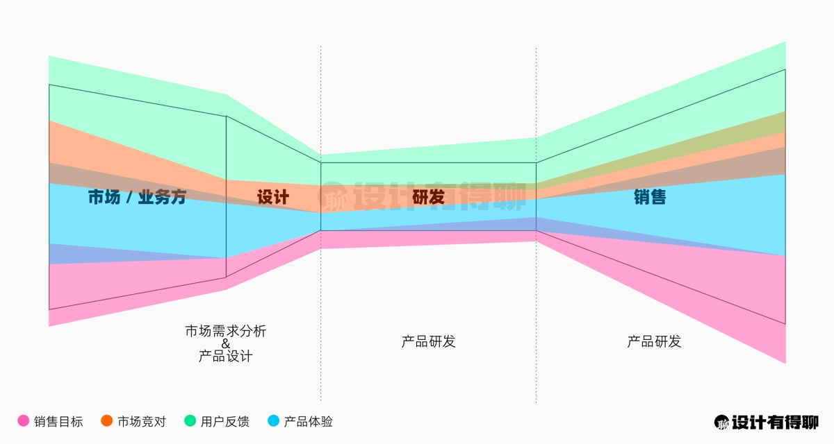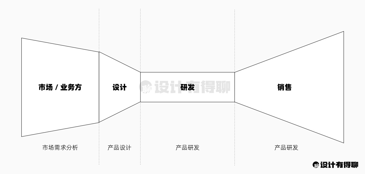 让我们再回到真实的业务场景中来,聊一聊工具技能与设计思维。很多初入行的设计师都会遇到过这样一个误解:一个产品从诞生到上线,是一个线性的过程。业务团队根据市场需求提出产品概念,设计师负责视觉和交互设计,然后研发团队进行开发,最终产品上线并开始销售。