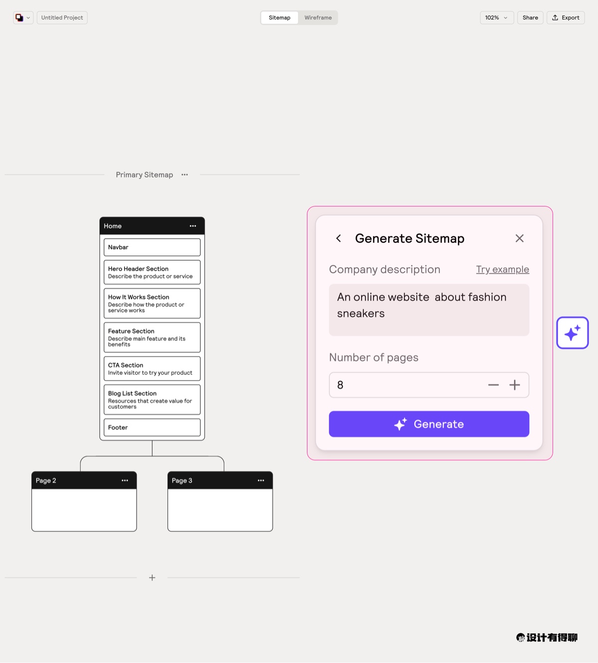 Relume 是一款基于平台自建设计物料库的 AI 辅助设计工具,它能通过关键词自动生成产品站点或 App 的 Sitemap 以及界面模块内容 并转化成 Wireframe 线框稿。最后,设计师可以将生成的 Wireframe 直接导入到 Figma 或 Webflow,再进行具体的业务需求的设计。