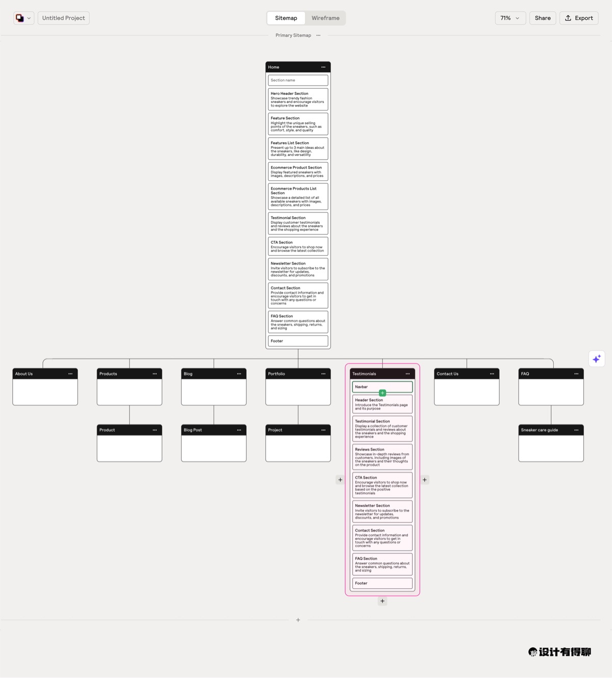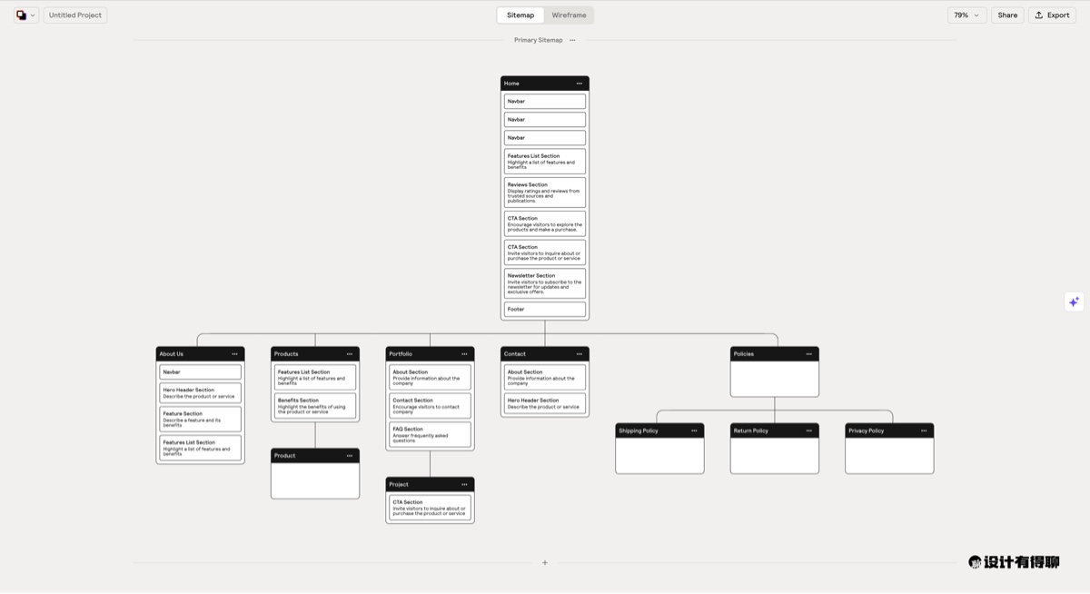 在产品的早期阶段,通过 Relume 的 Sitemap 生产和线框图能力,能够为设计师或产品经理提供快速梳理业务设计的能力。这种从更宏观、全局视角出发的方法,不仅能够加速前期的设计效率,还可以间接的提升项目设计过程中整体的一致性。