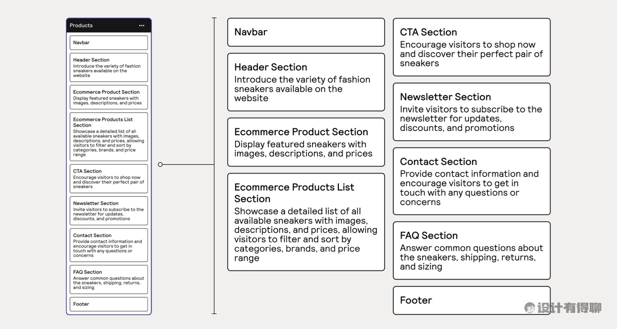 Relume 不仅能生成站点的 Sitemap,它还会根据我们输入的描述语来编排界面中的模块。大家可以看看下图右侧中的部分,这是根据我刚才的描述所生成的「产品列表」页的模块内容。