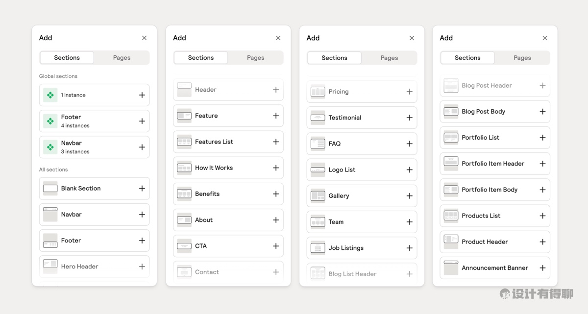 Relume 提供了一套自建的设计物料库,我们可以直接找到需要的模块并添加到界面中。官方提供的这套物料库只能说是中规中矩,和我们常见的同类产品比较类似,都是主要集中在前台场景较为标准化的部分。当然,就像我们之前说过的一样,这个并不是一个大问题,在后期可以慢慢的不断优化和补充。
