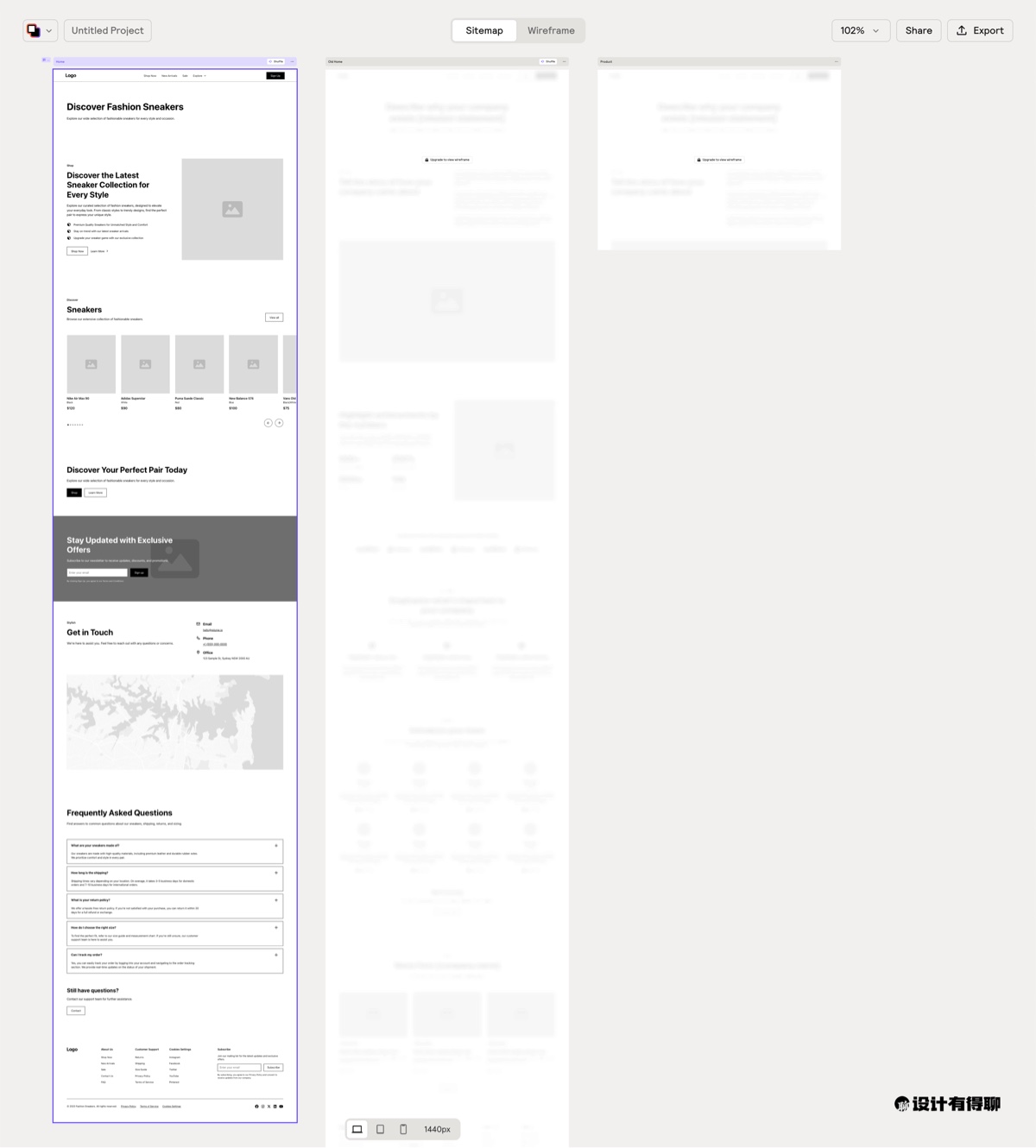 完成了界面模块的编排之后,我们可以切换到「Wireframe」模式,Relume 会自动将 Sitemap 中的文本描述模块全部转换成真实的设计模块,也就是我们前面提到的设计物料库中的资产内容。