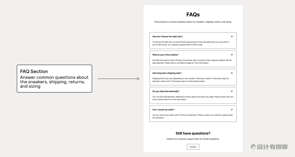 到这里,细心的同学大概已经发现在这个工具中,Relume 其实做了非常重要的一个工作,那就是建立界面中「文本描述」和真实的「设计模块」之间的关联。例如下图中左侧的「FAQ」,它对应的是右边真实的设计模块。