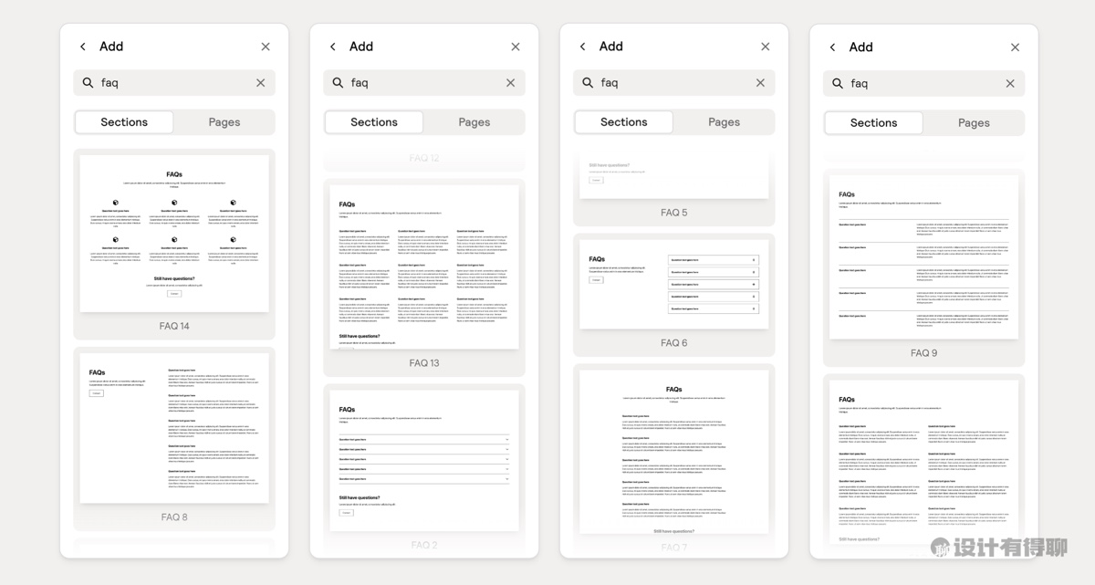 在 Relume 的物料库中,每一个模块都对应的提供了多种的设计模式,用户可以根据自己的需求进行选择。上面提到的「FAQ」在物料库中提供近 10 中设计模式,基本上可以覆盖掉大部分的需求场景。