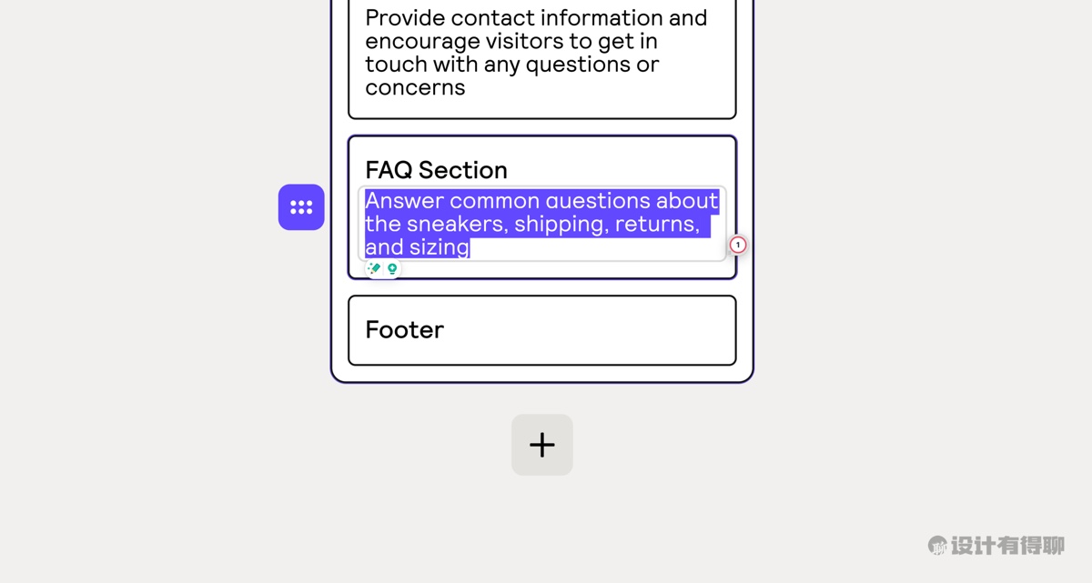 到这里我们需要回过头再提一下 Sitemap 中的模块文案编辑能力。它其实是为未来的 AI 能力扩展做了一些预留,当 Relume 的 AI 到达一定能力水准之后,它们就可以将用户描述的真实需求带入到 AI 中,生产更符合真实业务场景需求的界面设计。