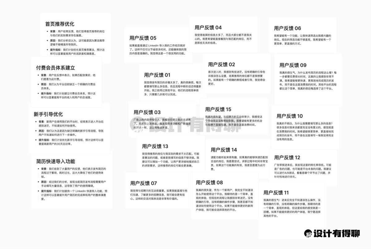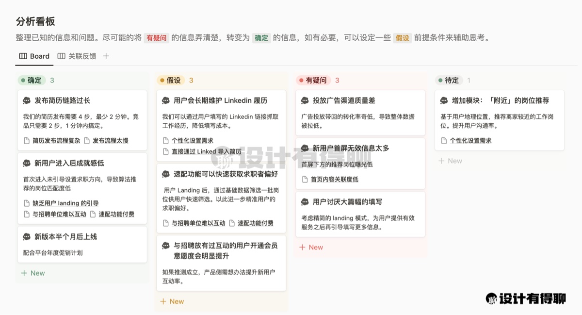 将我们前面收集到的信息按不同类型记录在分析看板中,每一条信息可以附上一些核心的描述并关联上内外部用户的反馈。