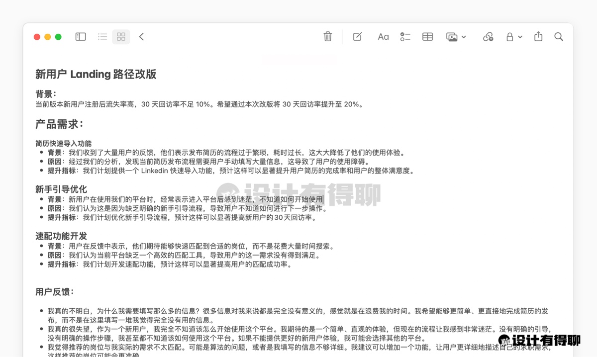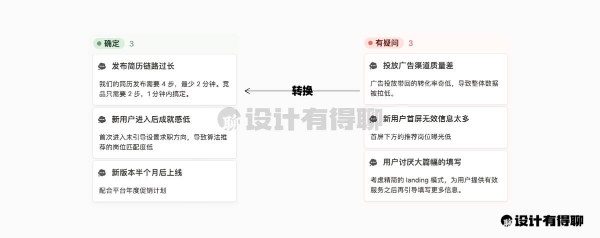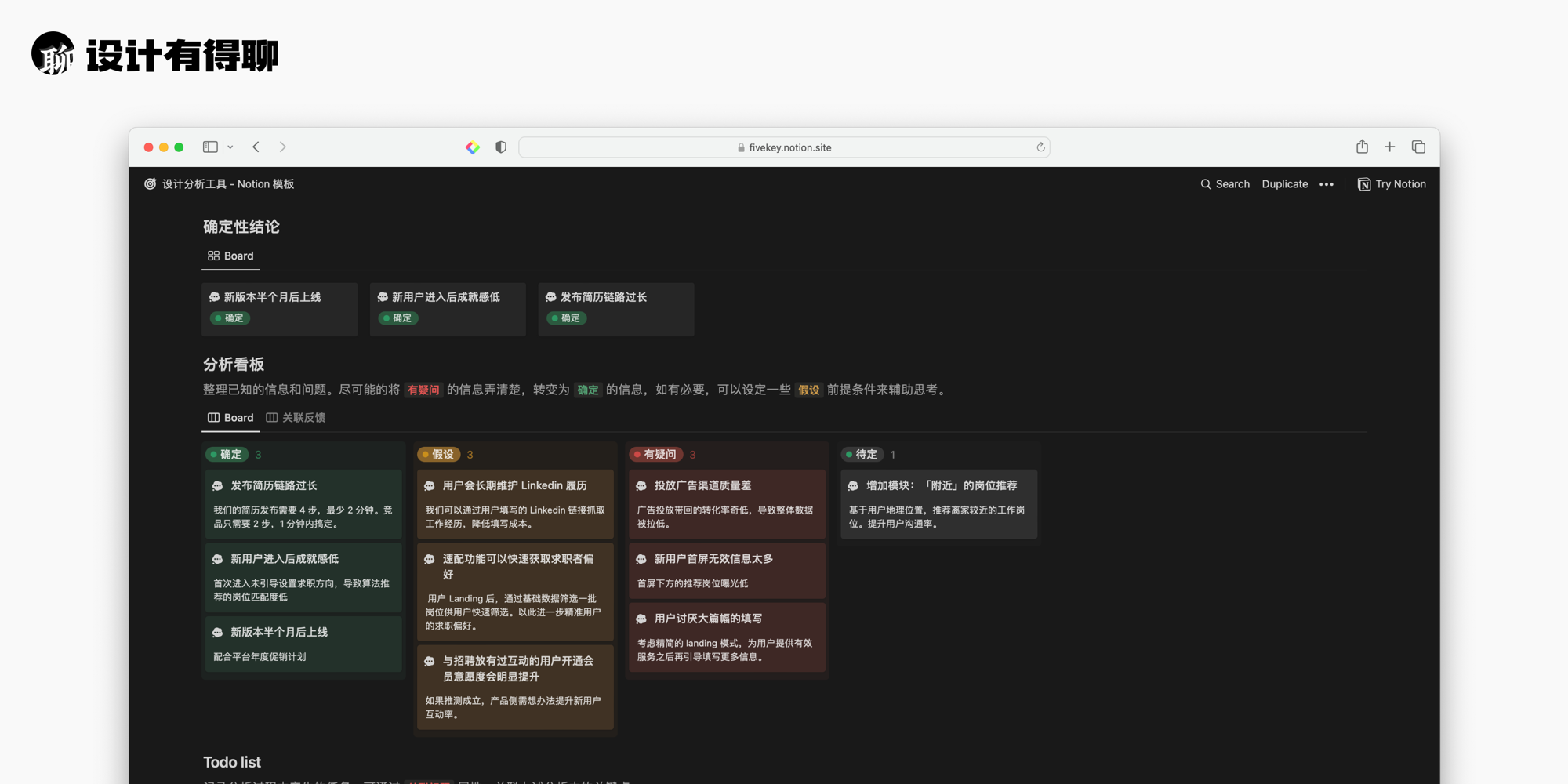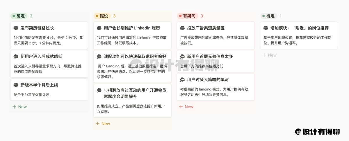 在需求分析的过程中会产生很多需要跟进的事项。比如我们前面提到的确定性事项「发布简历链路过长」,我们就可以留下一个后续 todo,去对这个流程做进一步的研究和分析。