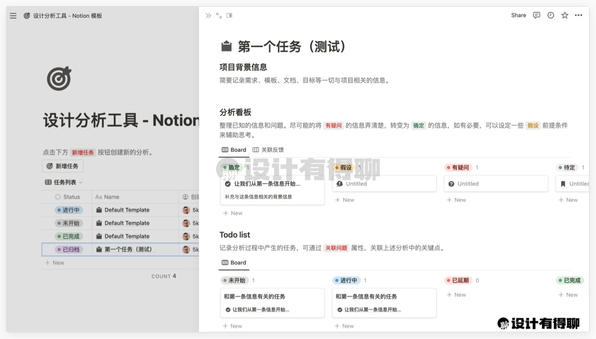 这个 Notion 模板主要由「任务列表」和「任务详情」组成。当接到新的需求时,可以新建一个分析任务,调用我设置好的模板开始工作。
