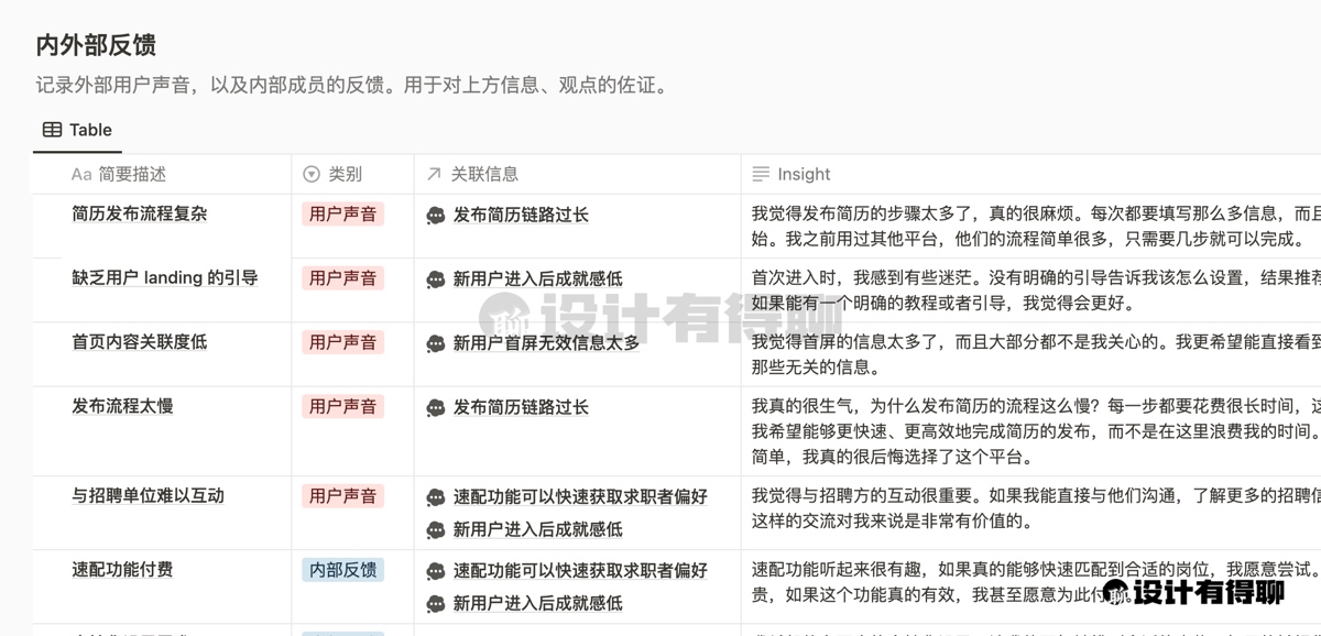 无论是外部的用户声音,还是内部的员工反馈,这些都是我们项目需求的原始出发点。可以将最具代表性的信息汇总在这里,为「分析看板」中的信息进行关联补充,同时也可以作为需求讨论时的辅助材料。