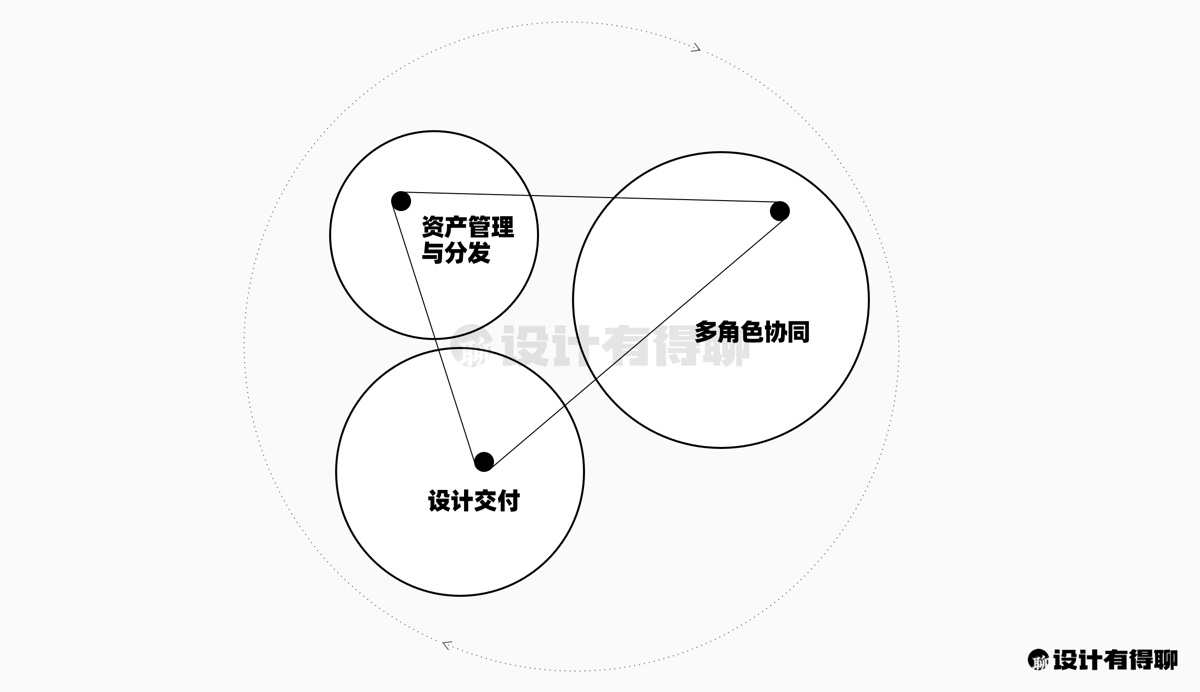 从过往这几年的经验来看,我认为在设计协同领域中有三个非常重要的组成部分:多角色协同、资产管理及分发、设计交付,它们一起共同构成了一个高效、协调的设计协同生态系统。
