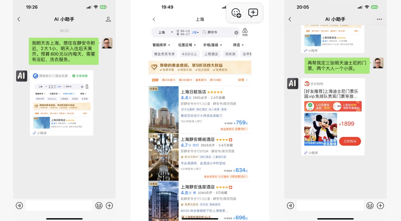 比如在微信中,我们可以让 AI 来根据要求来筛选酒店,帮助更快的进行决策。以前我们可能需要打开携程进入酒店板块,输入关键词搜索再进行筛选。有了 AI 未来我们可能就可以直接用文本来进行需求的描述,完成操作。