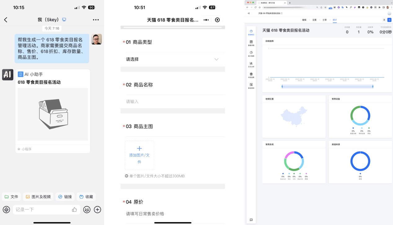 再比如在钉钉中,我们可以在办公 IM 中让 AI 来帮我们设计并搭建一个活动管理界面,向商家收集信息并在后台进行报名信息的管理。