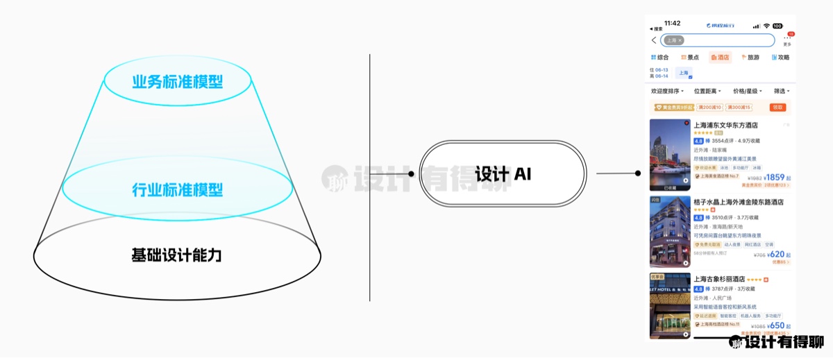 如果这是一个设计评审会,AI 大概率会被骂得体无完肤。而这中间的所出现的问题就是对酒店行业的理解以及对携程业务背景的理解。而这些就是我想要说的行业标准 box 和业务标准模型。这有这三层能力同时存在且靠谱,AI 才有可能帮助我们生成右边那张我们真正需要的界面设计。