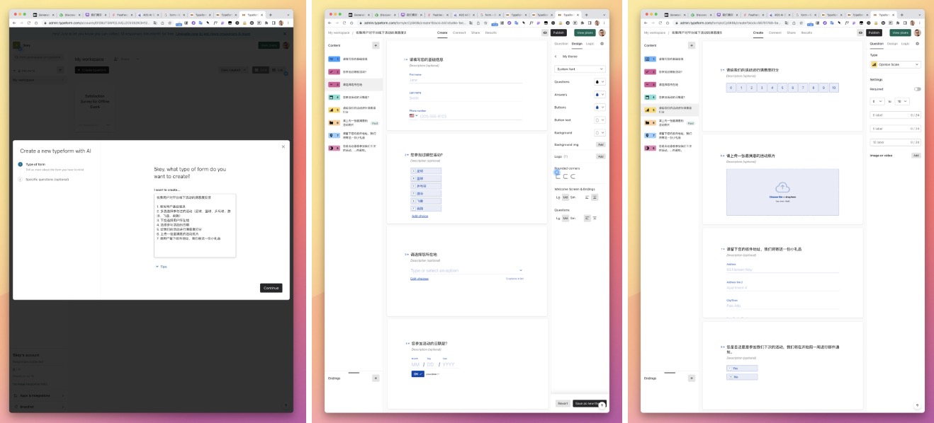 我们曾经聊到过,AI 天然就是设计系统最佳的“消费者”。特别是在 UI 界面中,它需要的生产效率,需要的是明确、可用的设计方案。它可以大到一个个具体的行业领域,也可以小到一个特定的场景,比如我们大家可能都曾有用到过的表单搭建工具 – Typeform。