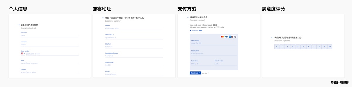 如果仔细查看 Typeform AI 生成的表单,你就会发现它们其实在做一些对行业标准和设计模式的抽象,将一些常用的模块根据经验进行了封装。比如下图中的个人信息、地址、支付方式、满意度。这些模块中的字段和组件形式就是它们对于这个领域的经验沉淀,有了这些内容,无论是在语义的识别还是结果的生成上,AI 可靠性都会大幅的提升。