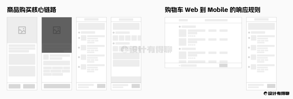 在电商的场景中,我们也可以将一些已经被验证并抽象沉淀的设计模式封装起来。比如从商品详情到购物车再到下单的购物核心链路,再比如某个功能界面从 Wed 到 Mobile 的响应规则。