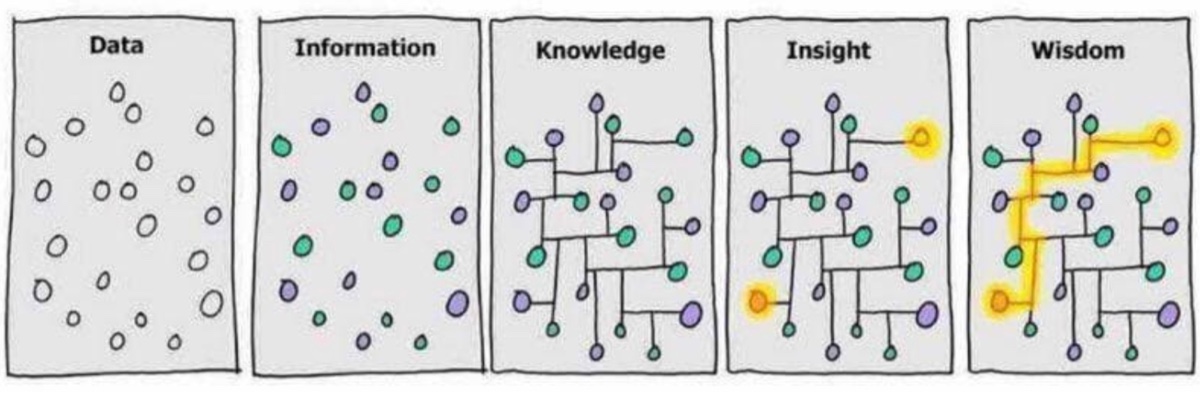 每次聊到这个话题的时候我都会想到下面这张图,无论作品集还是 PPT 我们大多时候都是在聊信息和知识,缺少核心见解(洞见)。
