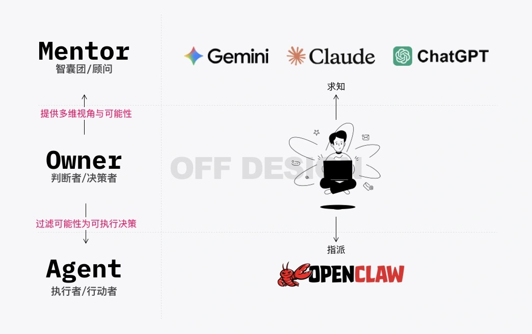 在这个新的生产关系里,三个角色各自承担着不同的职能。大模型作为 Mentor,它的天然就是发散的。问它一个问题,它可能会给你一百种可能性、十个方向、五套方案。它在不断地为整个系统提供熵增。