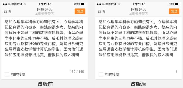 这两种方式给用户带来的感受是不一样的,例如发微博和回复微博的Text area(文本区域/多行文本输入区)字数限制提示由原来「当前已经输入的字数/140字」,改为「输入130字以后显示剩余可输入的字符数量」,这样做的好处是用户不会在刚开始输入时因为看到字数限制而刻意控制输入字数打断心流造成情绪不畅或者降低输入动机,也许能提高发微博和评论的活跃 。