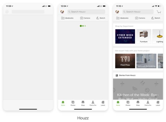 如家装社区Houzz,首先加载的是由顶栏、底栏构成的空白框架,其中顶栏已经预先透出了用户头像和搜索框的占位符;第二步加载了顶栏、二级顶栏和底栏的icon、搜索框等全局性元素。第三步才开始加载内容区。