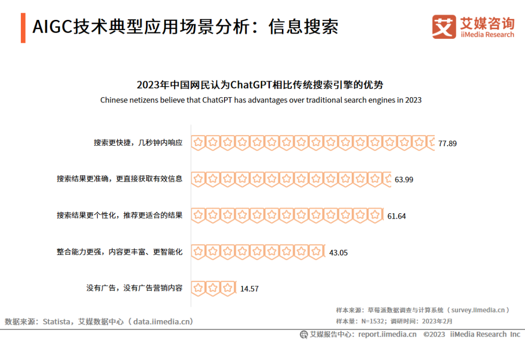 调研数据显示,搜索更快捷、搜索结果更精确更个性化、内容更丰富、没有广告是网民认为ChatGPT相比传统搜索引擎的优势所在。艾媒咨询分析师认为,ChatGPT类产品有望改善搜索体验、重塑信息生成和呈现方式,成为新的流量入口。传统搜索引擎产品将受到的冲击巨大,倒逼行业创新升级提速。未来传统搜索引擎将更加注重语言处理和人工智能技术,以提供更加精细和个性化的搜索体验。