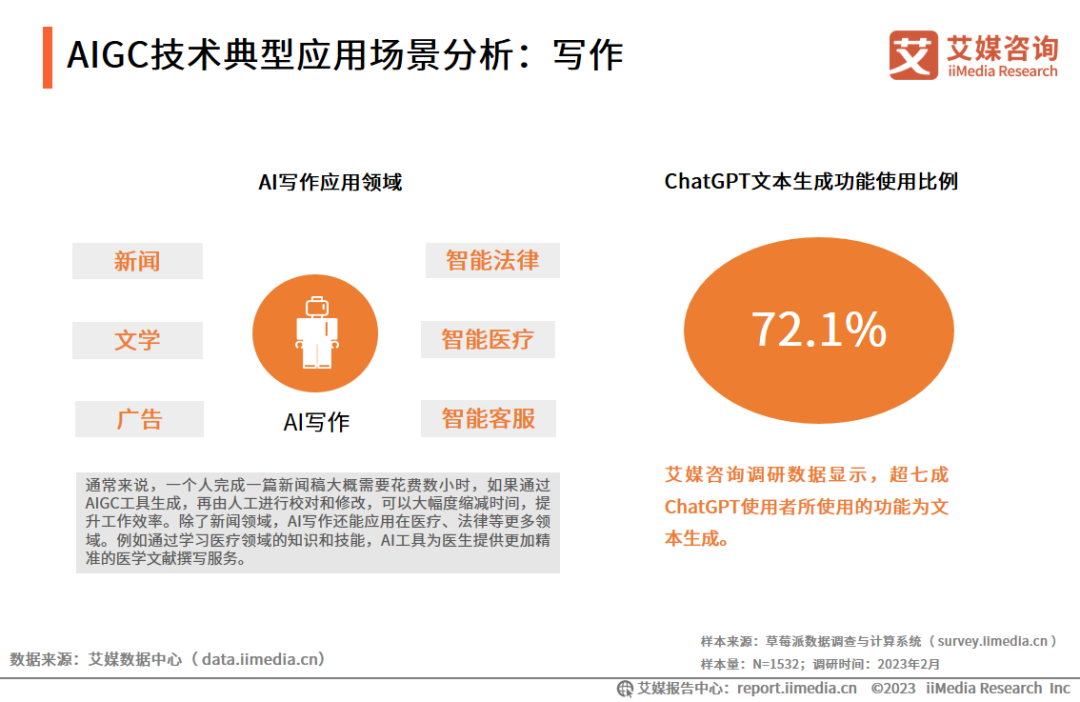调研数据显示,ChatGPT使用率最高的功能为文本生成,占比达72.1%。AI写作应用领域广泛,覆盖新闻、文学以及法律、医疗等专业知识领域。艾媒咨询分析师认为,随着人工智能技术的发展,AI智能写作将会愈发个性化,融合更多的知识和技能,为用户提供更加丰富、多样化、个性化的写作服务。