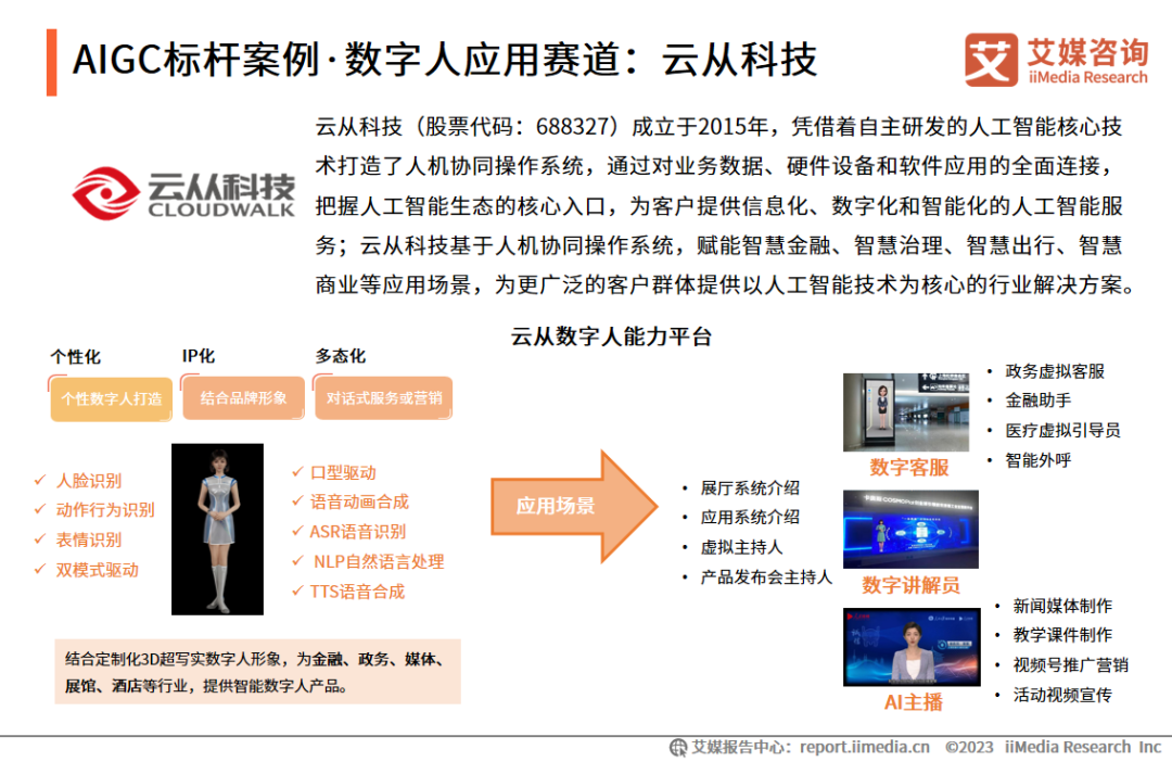 iiMedia Research(艾媒咨询)数据显示,虚拟人产业保持稳定增长态势。中国虚拟人带动产业市场规模和核心市场规模预计2025年分别达到6402.7亿元和480.6亿元。目前“深度合成+计算驱动”型的虚拟人,综合运用文本、图像、音频等生成技术,打造综合外观、面部表情、发声习惯等产出全面拟人化的数字内容,属于AIGC领域。此种多模态生成技术的聚合应用在虚拟偶像、虚拟主播等领域。